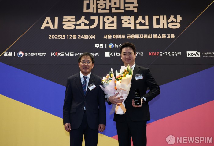 [서울=뉴스핌] 최지환 기자 = 이상창 기술보증기금 상임이사가 24일 오전 서울 영등포구 금융투자협회에서 뉴스핌 주최로 열린 대한민국 AI 중소기업 혁신 대상에서 이영준 모두싸인 대표에게 기술보증기금 이사장상을 시상하고 함께 기념촬영을 하고 있다. 2025.12.24 choipix16@newspim.com