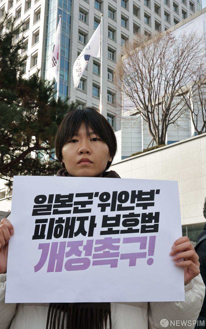 [서울=뉴스핌] 양윤모 기자 = 2015년 한일 일본군 '위안부' 합의가 체결된 지 10년을 앞둔 24일 오전 정의기억연대와 한일역사정의평화행동 등 시민단체 회원들이 서울 종로구 외교부 앞에서 한일합의 전면 무효·소녀상 테러 처벌·일본군 위안부 피해자 보호법 개정 촉구 기자회견를 개최후 피켁을 들고 있다. 2025.12.24 yym58@newspim.com