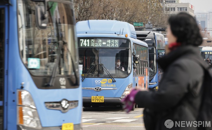 [서울=뉴스핌] 양윤모 기자 = 24일 통상임금이 쟁점인 임금 협상에서 사측과 이견을 좁히지 못한 서울시버스노동조합이 내년 1월 13일 전면 파업에 돌입하기로 결정한 가운데, 서울 종로구 세종대로에서 시민들이 버스를 기다리고 있다. 2025.12.24 yym58@newspim.com