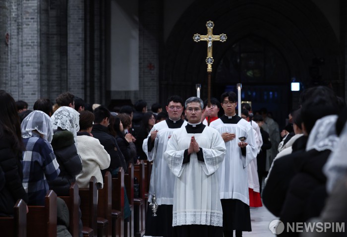 [서울=뉴스핌] 최지환 기자 = 성탄절인 25일 새벽 서울 중구 명동대성당에서 정순택 천주교 서울대교구 대주교의 주님 성탄 대축일 밤 미사 집전에 앞서 사제들이 입당하고 있다. 2025.12.25 choipix16@newspim.com