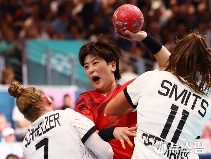 [파리 로이터 = 뉴스핌 ] 박상욱 기자 = 한국의 류은희가 2024년 파리올림픽 여자 핸드볼 조별리그 A조 1차전 독일과 경기에서 슛을 시도하고 있다. 2024.7.26 psoq1337@newspim.com
