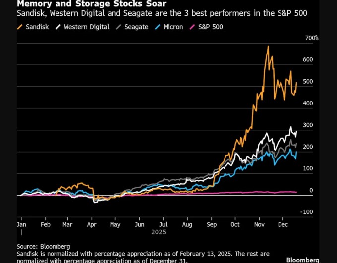 투자자들은 2025년 AI 관련 새로운 투자 기회를, 수십억 달러 규모로 약속된 자본 지출이 어디로 향하는지를 따라가며 발견했다. S&P 500 지수의 상위 종목만 봐도 이를 확인할 수 있다. 메모리와 저장장치 기업 샌디스크(SNDK)가 선두에 섰고, 하드디스크 드라이브 제조업체 웨스턴 디지털(WDC)과 그 경쟁사 시게이트 테크놀로지(STX)가 뒤를 이었다. 미국 최대 메모리 칩 제조업체 마이크론 테크놀로지(MU)는 다섯 번째에 올랐다.
