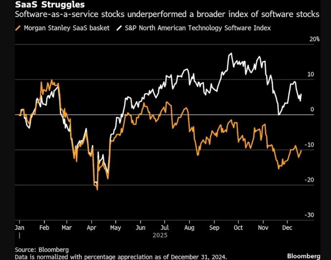 서비스나우(NOW), 어도비(ADBE), 세일즈포스(CRM) 같은 기업들은 올해 기술 업종에서 가장 부진한 성과를 보였다. 모간스탠리의 SaaS 기업 지수는 10% 하락했으며, 마이크로소프트(MSFT)처럼 AI 수혜주로 평가받는 기업들을 포함한 광범위한 소프트웨어 지수는 약 6% 상승했다.