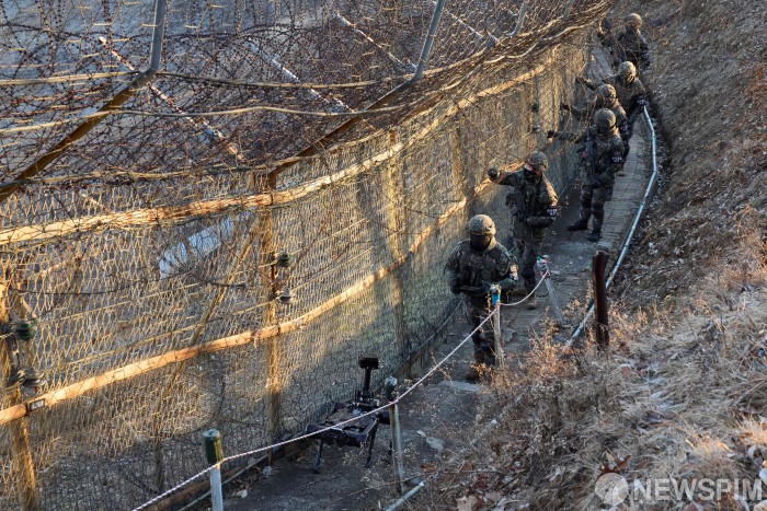 [연천=뉴스핌] 류기찬 기자 = 철책선 넘어 밝아오는 태양 아래, 군은 새로운 전투 시대를 맞이하고 있다. 지난 22일 오전 경기 연천군 5사단 열쇠부대 군 장병들이 지난해부터 대테러작전·수색·정찰 등 다양한 군사 임무에서 시범운용중인 다족 보행 로봇과 함께 철책 경계 근무에 나서고 있다. 다족 보행 로봇은 육군이 추진 중인 차세대 전투체계 ‘아미 타이거’ 전투실험의 하나로 또 다른 전투원 역할을 수행하기 위해 투입됐다. 2025.12.29 ryuchan0925@newspim.com