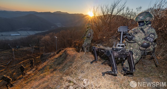 [연천=뉴스핌] 류기찬 기자 = 철책선 넘어 밝아오는 태양 아래, 군은 새로운 전투 시대를 맞이하고 있다. 지난 22일 오전 경기 연천군 5사단 열쇠부대 군 장병들이 지난해부터 대테러작전·수색·정찰 등 다양한 군사 임무에서 시범운용중인 다족 보행 로봇과 함께 철책 경계 근무에 나섰다. 다족 보행 로봇은 육군이 추진 중인 차세대 전투체계 '아미 타이거' 전투실험의 하나로 또 다른 전투원 역할을 수행하기 위해 투입됐다. 2025.12.29 ryuchan0925@newspim.com