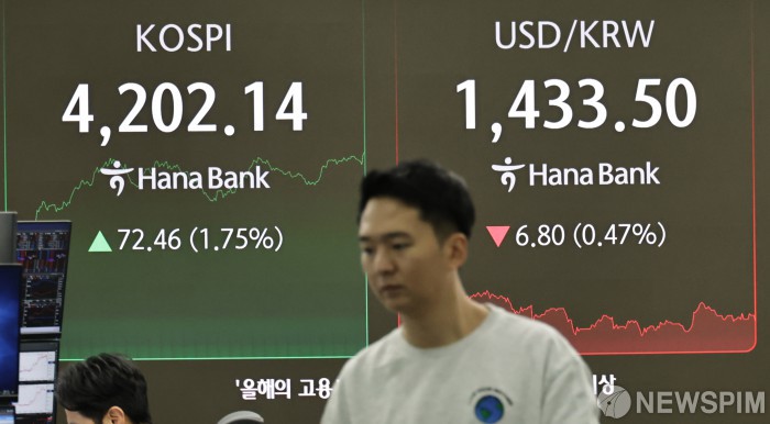 [서울=뉴스핌] 양윤모 기자 = 29일 오후 코스피가 전장 종가보다 72.46포인트(1.75%) 상승하며 4202.14로, 코스닥은 12.31 포인트(1.34%) 상승한 931.98로 거래되고 있는 가운데, 서울 중구 하나은행 딜링룸에서 직원들이 업무를 보고 있다. 서울외환시장에서 달러/원 환율은 전장 대비 6.80원 하락한 1433.50원에 거래되고 있다. 2025.12.29 yym58@newspim.com