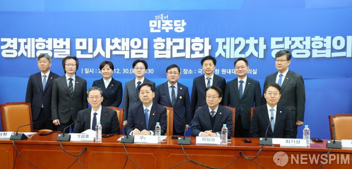 [서울=뉴스핌] 정일구 기자 = 권칠승 경제형벌민사책임 TF 단장과 구윤철 부총리 겸 기획재정부 장관을 비롯한 각 부처 장관들과 경제형벌 TF 위원들이 30일 오전 서울 여의도 국회에서 열린 경제형벌 민사책임 합리화 제2차 당정협의에서 기념촬영을 하고 있다. 2025.12.30 mironj19@newspim.com