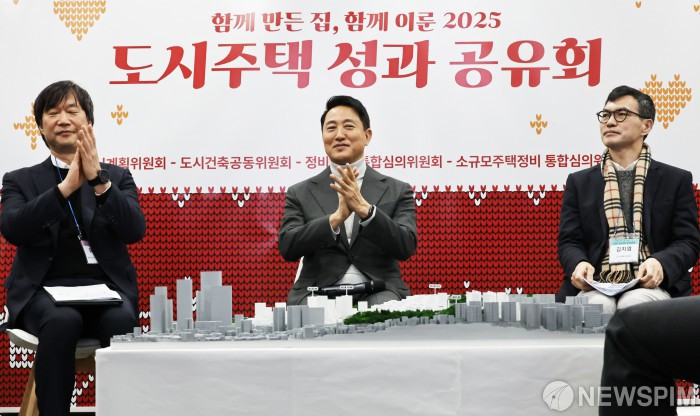 [서울=뉴스핌] 양윤모 기자 = 오세훈 서울시장이 30일 서울시청에서 개최된 '2025 도시주택 성과 공유회'에 참석해 박수를 보내고 있다. 2025.12.30 yym58@newspim.com