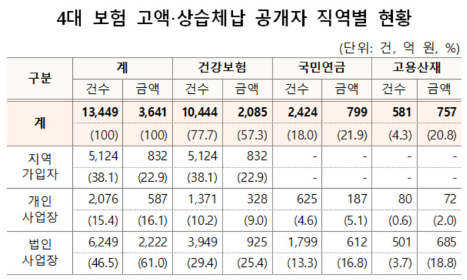 올해 공개된 체납자 수는 1만3449명으로 지난해(1만3688명)보다 1.7% 줄었다. 건강보험 체납자가 1만444명으로 가장 많았으며, 다음으로는 국민연금(2424명)과 고용·산재보험(581명) 순이었다.