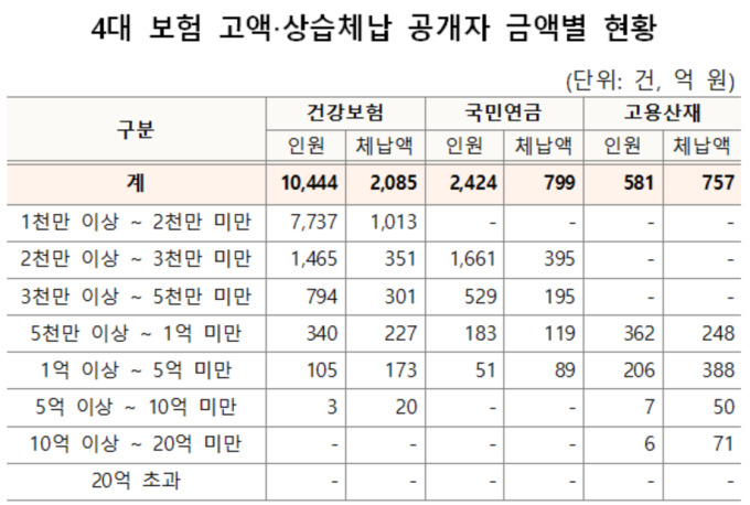 금액별로는 건강보험 체납자의 다수가 1000만~2000만원 구간에 몰려 있었다. 이 구간 체납자는 7737명으로 전체 건강보험 체납자의 약 74%를 차지했다. 고용·산재보험 체납자는 1억원 이상 고액 체납 비중이 상대적으로 높았다.