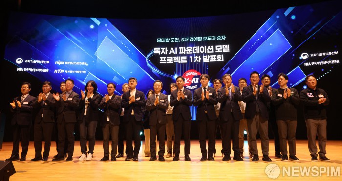 [서울=뉴스핌] 최지환 기자 = 배경훈 부총리 겸 과학기술정보통신부 장관, 하정우 AI미래기획수석비서관 등이 30일 오후 서울 강남구 코엑스에서 열린 '독자 AI 파운데이션 모델' 프로젝트 1차 발표회에서 기념촬영을 하고 있다. 2025.12.30 choipix16@newspim.com