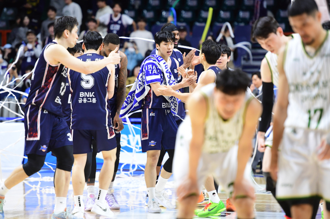 [서울=뉴스핌] KCC 선수들이 지난 6일에 열린 DB와의 홈 경기에서 승리를 거둔 뒤 환호하고 있다. [사진 = KBL] 2025.12.30 wcn05002@newspim.com