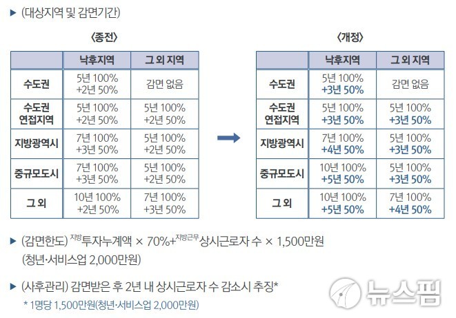 다만 앞으로는 낙후지역으로 이전한 수도권과 수도권 연접기업은 3년동안 각각 50%를, 지방광역시의 기업은 7년간 100%와 4년간 50%를, 중규모도시는 10년간 100%와 5년간 50%의 세제 혜택을 받는다.