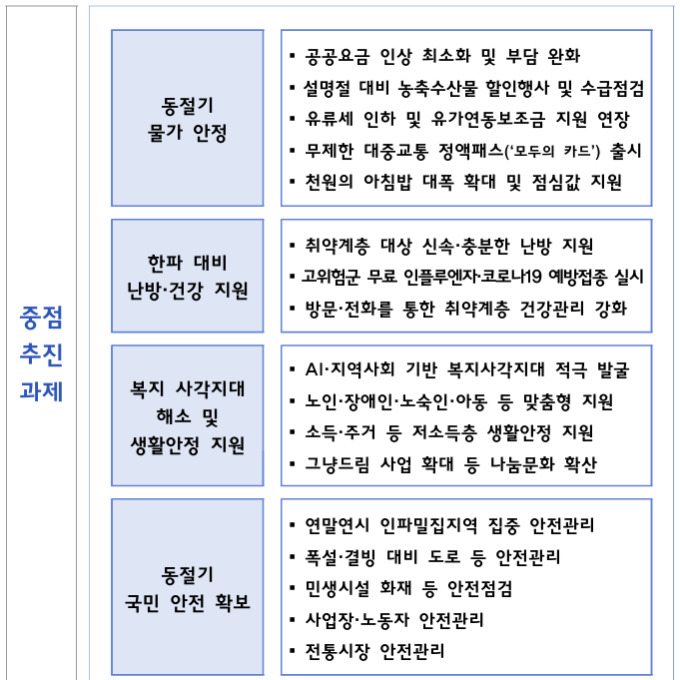 난방·연료·대중교통·식비·주거·안전 등 전방위 대응