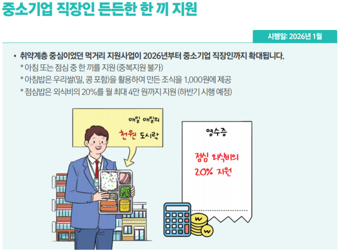 정부는 그동안 취약계층 대상으로만 시행됐던 먹거리 지원사업이 내년부터 중소기업 직장인 대상으로 확대된다고 밝혔다.