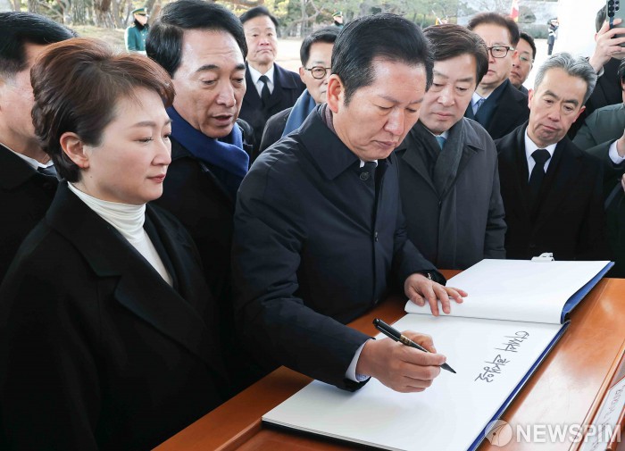 [서울=뉴스핌] 윤창빈 기자 = 정청래 더불어민주당 대표가 1일 오전 서울 동작구 국립서울현충원에서 2026 신년 참배를 마치고 방명록을 작성하고 있다. 2026.01.01 pangbin@newspim.com