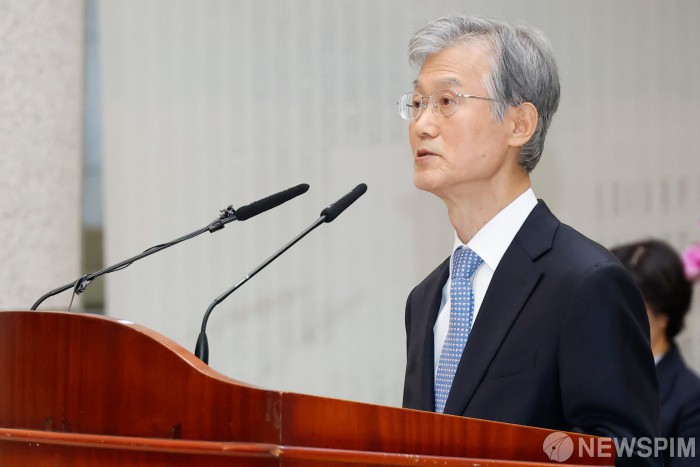 [서울=뉴스핌] 류기찬 기자 = 조희대 대법원장이 2일 오전 서울 서초구 대법원에서 열린 시무식에서 시무식사를 하고 있다. 2026.01.02 ryuchan0925@newspim.com