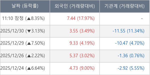 [장중수급포착] 퀀타매트릭스, 외국인 5일 연속 순매수행진... 주가 +8.35%