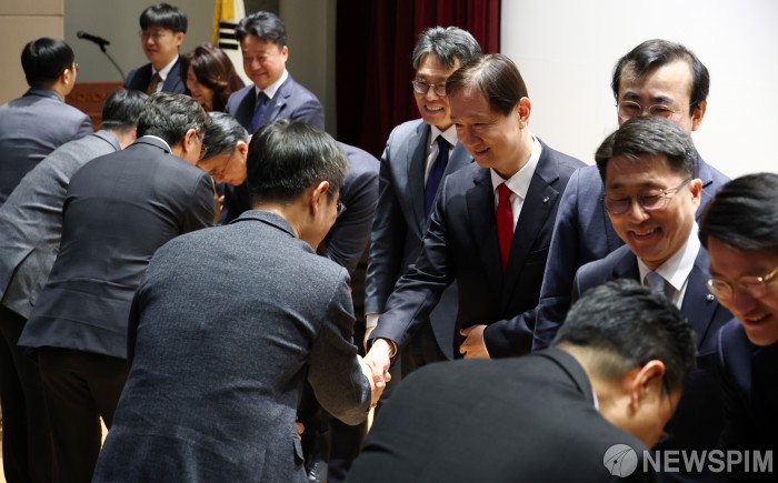 [서울=뉴스핌] 최지환 기자 = 이찬진 금융감독원장이 2일 오전 서울 영등포구 금융감독원에서 열린 금융감독원 시무식에서 임직원들과 신년인사를 하고 있다. 2026.01.02 choipix16@newspim.com