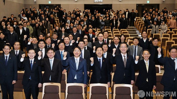 [서울=뉴스핌] 구윤철 부총리 겸 재정경제부 장관이 2일 정부세종청사에서 열린 재정경제부 출범식에서 참석자들과 함께 기념촬영을 하고 있다. [사진=재정경제부] 2026.01.02 photo@newspim.com