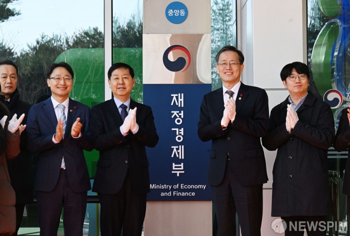 [서울=뉴스핌] 구윤철 부총리 겸 재정경제부 장관이 2일 정부세종청사에서 열린 재정경제부 출범식에서 참석자들과 함께 재정경제부 현판식을 하고 있다. [사진=재정경제부] 2026.01.02 photo@newspim.com
