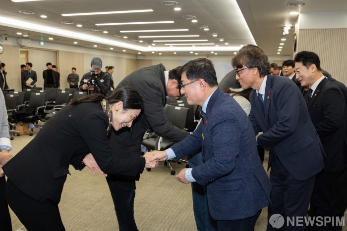 [서울=뉴스핌] 김성환 기후에너지환경부 장관이 2일 정부세종청사에서 열린 2026년 기후에너지환경부 시무식에서 직원들과 인사를 나누고 있다. [사진=기후에너지환경부] 2026.01.02 photo@newspim.com