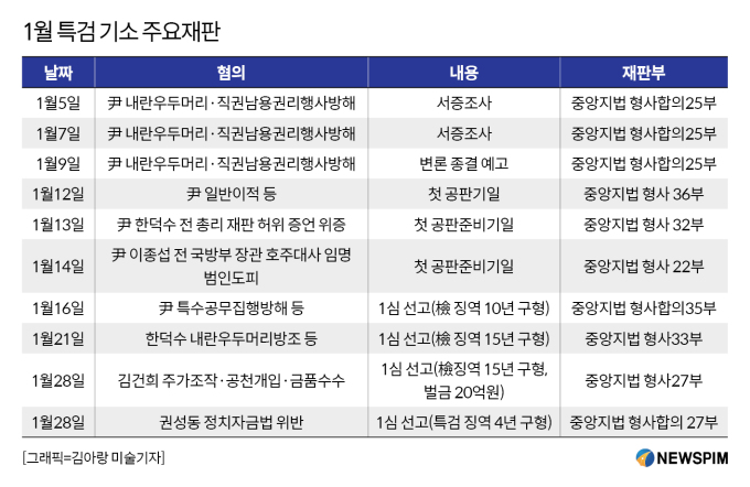 [서울=뉴스핌] 김지나 기자 = 윤석열 전 대통령과 김건희 여사의 운명의 1월이 시작됐다. 1월에는 12·3 비상계엄과 관련한 본류 사건인 윤 전 대통령의 내란우두머리·직권남용 권리행사방해 혐의 사건의 변론 종결을 비롯해 김건희 여사, 한덕수 전 국무총리, 권성동 국민의힘 의원 등에 대한 주요 재판 선고가 잇따라 예정돼 있다.