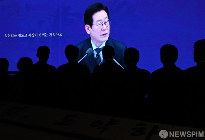 [서울=뉴스핌] 사진공동취재단 = 김민석 국무총리를 비롯한 경제계 인사들이 2일 오후 서울 중구 대한상공회의소 국제회의장에서 열린 ‘2026 경제계 신년인사회’에서 이재명 대통령의 영상을 보고 있다. 2026.01.02 photo@newspim.com