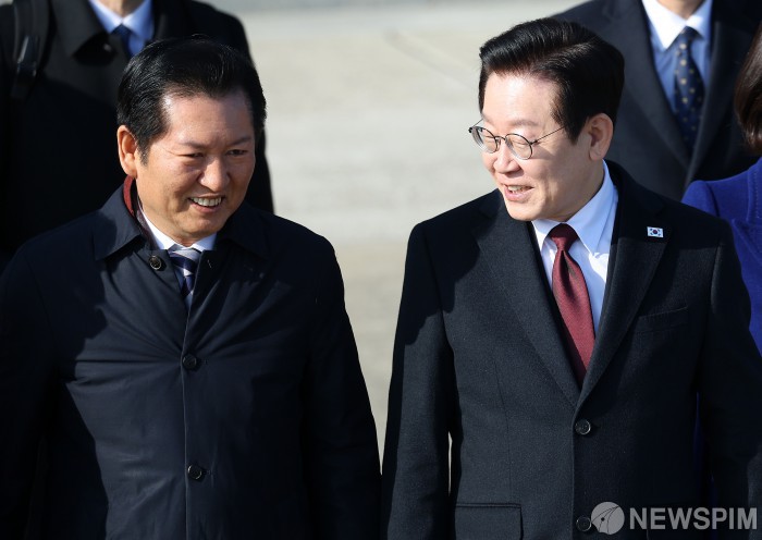 [성남=뉴스핌] 정일구 기자 = 새해 첫 해외 순방 일정으로 중국을 국빈 방문하는 이재명 대통령이 4일 오후 경기 성남시 서울공항에서 공군 1호기로 이동하며 정청래 더불어민주당 대표와 대화하고 있다. 2026.01.04 mironj19@newspim.com