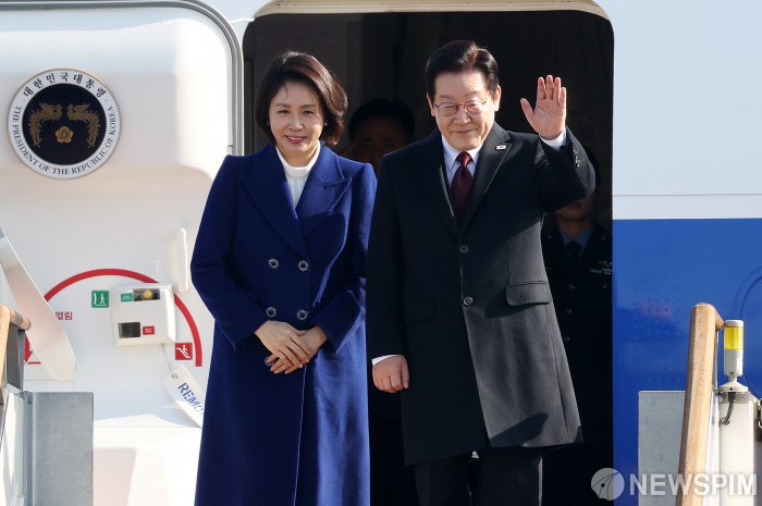 [성남=뉴스핌] 정일구 기자 = 새해 첫 해외 순방 일정으로 중국을 국빈 방문하는 이재명 대통령과 김혜경 여사가 4일 오후 경기 성남시 서울공항에서 공군 1호기에 올라 인사하고 있다. 2026.01.04 mironj19@newspim.com