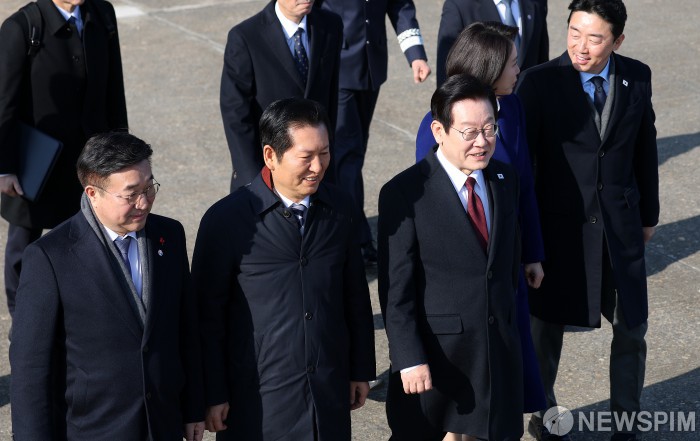 [성남=뉴스핌] 정일구 기자 = 새해 첫 해외 순방 일정으로 중국을 국빈 방문하는 이재명 대통령과 김혜경 여사가 4일 오후 경기 성남시 서울공항에서 공군 1호기에 탑승하고 있다. 2026.01.04 mironj19@newspim.com