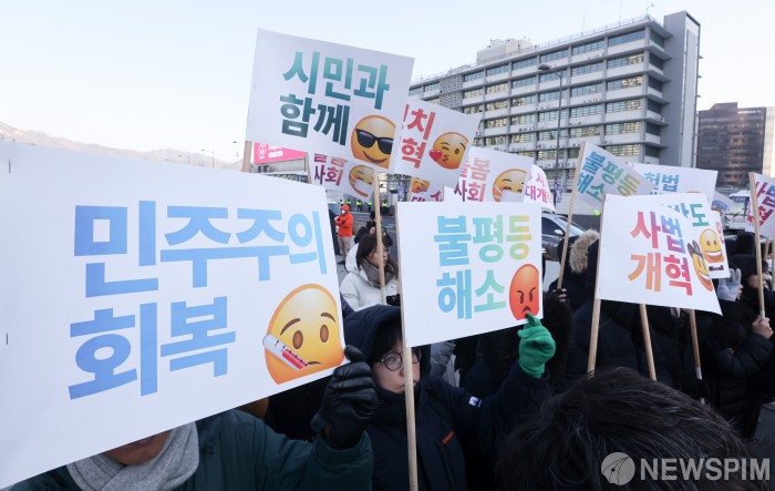 [서울=뉴스핌] 최지환 기자 = 5일 오전 서울 종로구 광화문광장에서 열린 참여연대 2026 신년 기자회견에서 참가자들이 2026년 활동방향과 과제가 적힌 깃발을 들고 있다. 2026.01.05 choipix16@newspim.com