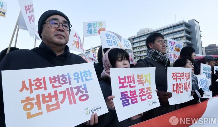 [서울=뉴스핌] 최지환 기자 = 5일 오전 서울 종로구 광화문광장에서 열린 참여연대 2026 신년 기자회견에서 참가자들이 피켓을 들고 있다. 2026.01.05 choipix16@newspim.com