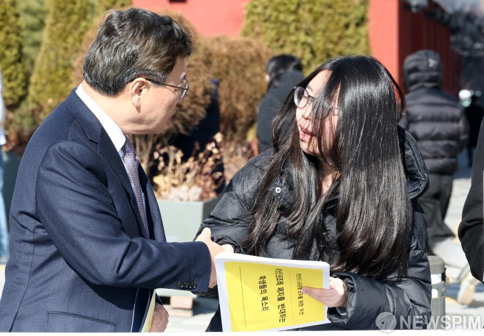 [서울=뉴스핌] 최지환 기자 = 정근식 서울시교육감이 5일 오후 서울 중구 서울시의회 본관 앞에서 학생인권조례 폐지 관련 재의요구 입장문 발표를 앞두고 기자회견 참여 학생과 인사하고 있다. 2026.01.05 choipix16@newspim.com