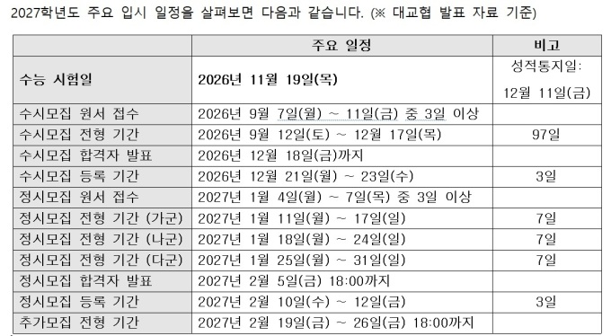 입시를 준비하는 수험생들이 제일 중요시하는 '2027학년도 수능시험'은 '2026년 11월 19일(목)'에 실시될 예정이며, '수능 성적 통지일'은 '2026년 12월 11일(금)'입니다.