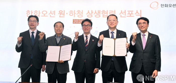 [서울=뉴스핌] 최지환 기자 = 5일 오후 서울 중구 한화오션 서울사무소에서 열린 한화오션 원·하청 상생협력 선포식에서 김희철 한화오션 대표이사와 김성구 한화오션 사내협력사협의회장이 원·하청 상생협력 협약서에 서명한 뒤 참석자들과 기념촬영을 하고 있다. 왼쪽부터 김경수 지방시대위원장, 김성구 사내협력사협의회장, 김민석 국무총리, 김희철 한화오션 대표이사, 권창준 고용노동부 차관. 2026.01.05 choipix16@newspim.com