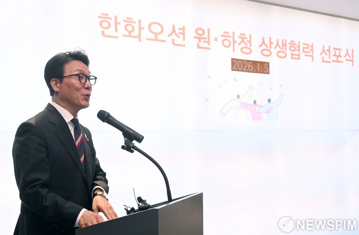 [서울=뉴스핌] 최지환 기자 = 김민석 국무총리가 5일 오후 서울 중구 한화오션 서울사무소에서 열린 한화오션 원·하청 상생협력 선포식에서 발언하고 있다. 2026.01.05 choipix16@newspim.com