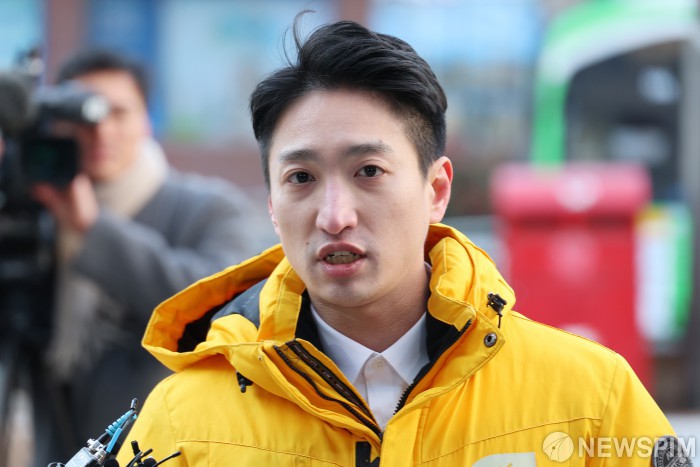 [서울=뉴스핌] 류기찬 기자 = 강선우 의원을 경찰에 고발한 이상욱 정의당 강서구위원장이 5일 오후 서울 강서구 강서경찰서에 고발인 조사를 받기 위해 출석하며 입장을 밝히고 있다. 2026.01.05 ryuchan0925@newspim.com