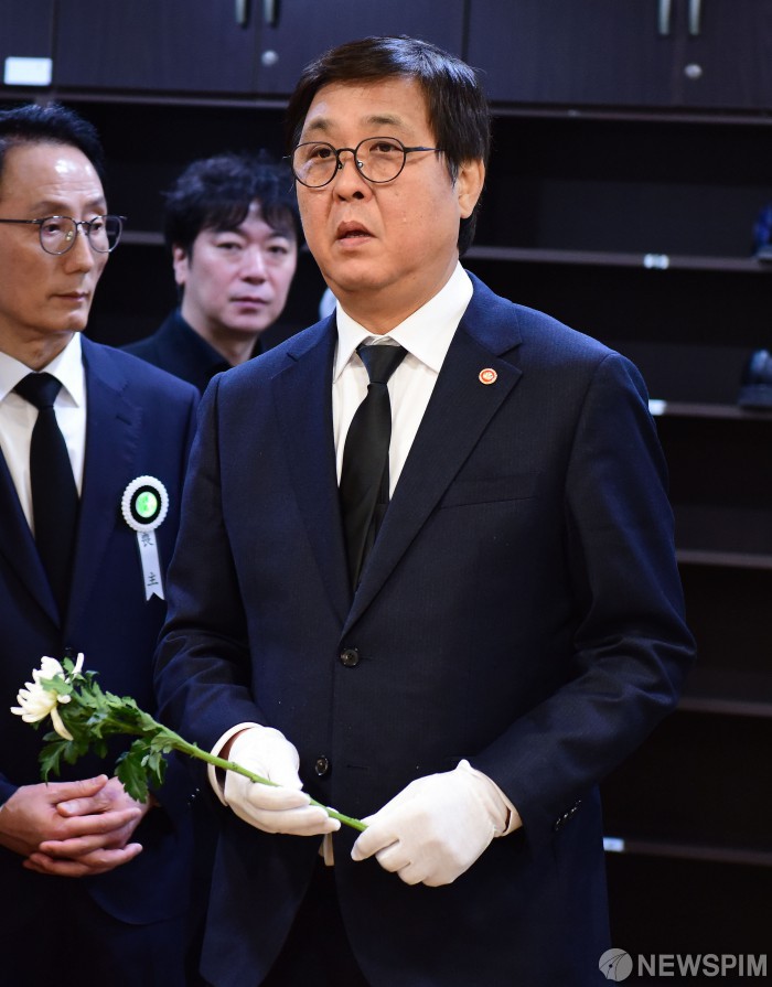 [서울=뉴스핌] 사진공동취재단 = 최휘영 문화체육관광부 장관(오른쪽)이 5일 서울 성모병원 장례식장에 마련된 고(故) 안성기 배우의 빈소를 조문하고 있다. 2026.01.05 photo@newspim.com