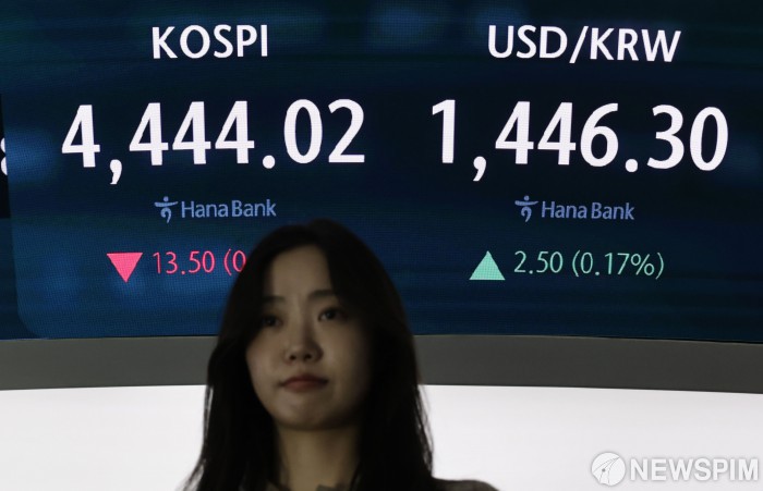 [서울=뉴스핌] 양윤모 기자 = 6일 오전 코스피가 전장 종가보다 13.50 포인트(0.32%) 하락하며 4444.02로, 코스닥은 0.98 포인트(0.10%) 상승한 958.48로 장을 시작한 가운데, 서울 중구 하나은행 딜링룸에서 직원들이 업무를 보고 있다. 서울외환시장에서 달러/원 환율은 전장 대비 2.50원 상승한 1446.30원에 주간거래를 시작했다. 2026.01.06 yym58@newspim.com