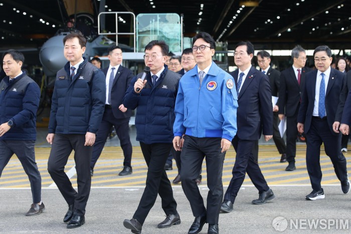 [서울=뉴스핌]김민석 국무총리는 7일 경남 사천 한국항공우주산업(KAI)을 방문해, 생산이 완료된 KF-21 보라매 전투기의 내부 장비 등을 둘러보며 성능 및 운용에 대한 설명을 청취하고 있다. [사진=총리실] 2026.01.07 photo@newspim.com