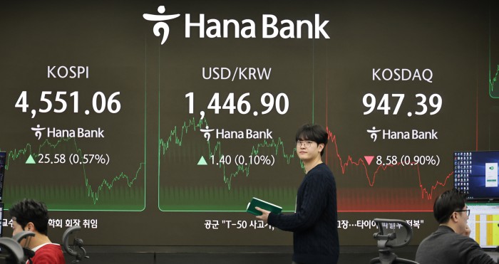 한국거래소에 따르면 이날 오전 9시 23분 기준 코스피 지수는 전 거래일 대비 1.90포인트(0.04%) 내린 4549.16에 거래되고 있다. 개인이 7974억원을 순매수하는 가운데 외국인과 기관은 각각 3298억원, 4468억원을 순매도 중이다. 코스피는 전일 대비 0.43% 하락한 4531.46으로 출발한 뒤 장 초반 반등했으나, 이후 상승 폭을 반납하며 보합권에서 등락을 이어가고 있다.