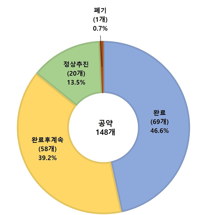 공약 완료율은 85.8%(127개)이며 공약 이행률 96.1%는 완료사업(69개·이행률 100%)과 완료 후 계속 추진(58개·이행률 100%), 정상 추진(20개) 중인 사업별 추진 정도를 백분율로 환산한 평균값이다.