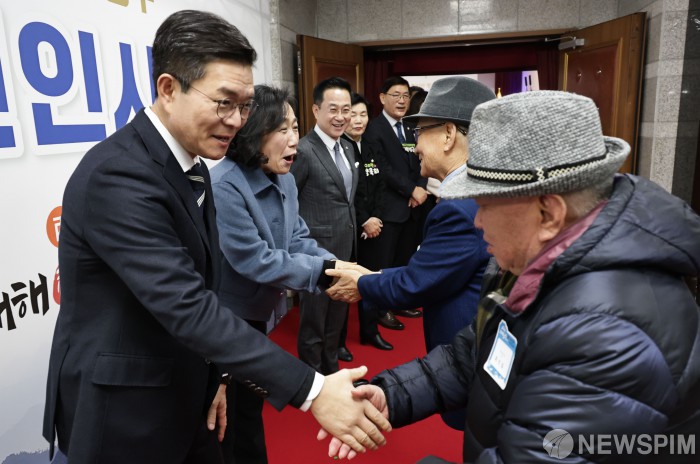 [서울=뉴스핌] 양윤모 기자 = 정원오 성동구청장이 8일 오후 서울 성동구 행당동 성동구청 대강당에서 개최된 '2026 성동구 신년인사회'에서 행사 참석자들과 인사를 하고 있다. 더불어민주당 서울시장 후보군으로 거론되는 정원오 성동구청장은 최근 서울의 주택 공급 부족 현상은 오세훈 서울시장으로부터 비롯됐다고 직격했다. 2026.01.08 yym58@newspim.com