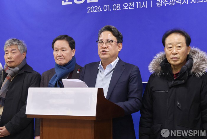 [광주=뉴스핌] 박진형 기자 = 문상필 더불어민주당 부대변인이 8일 광주시의회에서 문인 북구청장 사퇴 철회에 대한 기자회견을 열고 비판 성명을 발표하고 있다. 2026.01.08 bless4ya@newspim.com