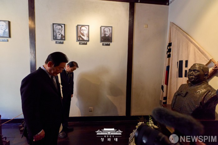 [서울=뉴스핌] 이재명 대통령이 지난 7일 중국 상하이 대한민국 임시정부 청사에서 열린 청사 건립 100주년 기념식을 마친 뒤 백범 김구 선생 흉상 앞에서 묵념을 하고 있다. [사진=청와대] 2026.01.08 photo@newspim.com