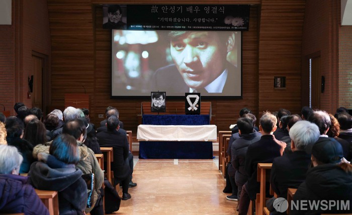 [서울=뉴스핌] 윤창빈 기자 = 9일 서울 중구 명동성당 파밀리아 채플홀에서 엄수된 배우 고(故) 안성기 영결식에 고인의 영상이 나오고 있다. 2026.01.09 pangbin@newspim.com