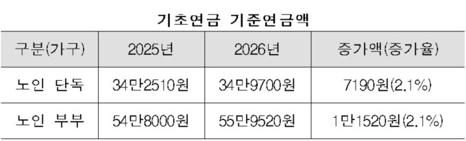 기초연금 기준연금액 역시 기초연금법에 따라 전년도 소비자물가상승률 2.1%를 반영해 지난해 34만2510원에서 2026년 34만9700원으로 7190원 인상된다. 779만명의 어르신들은 이달부터 인상된 기초연금액을 지급받는다.