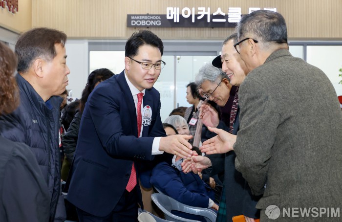 [서울=뉴스핌] 오언석 도봉구청장이 9일 도봉구청 1층 로비에서 '2026 도봉구 신년인사회'를 찾은 구민들과 인사를 나누고 있다.[사진=도봉구청] 2026.01.09 photo@newspim.com