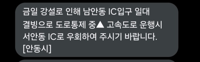 경북 안동시 재난문자[사진=재난문자 캡쳐] 2026.01.10 nulcheon@newspim.com